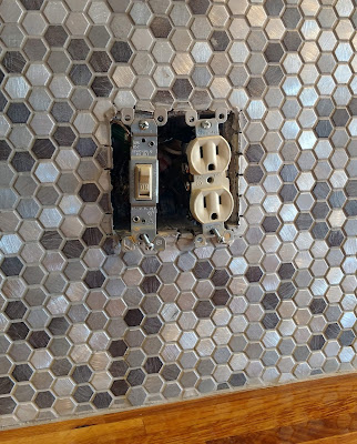 However... now that we had a fancy new backsplash, those old ivory outlets, switches and wall plates weren't going to cut it. I didn't want to go with white, but rather gray or silver so it would just kind of blend in with the mosaic tiles. I searched high and low at the home improvement stores -- most of the silver ones either looked too ornate or didn't have all of the matching pieces we needed. And all the gray ones were made for industrial/commercial use. Then I stumbled upon the Legrand Radiant collection at Lowe's, which gave me hope. The Nickel color definitely had potential.